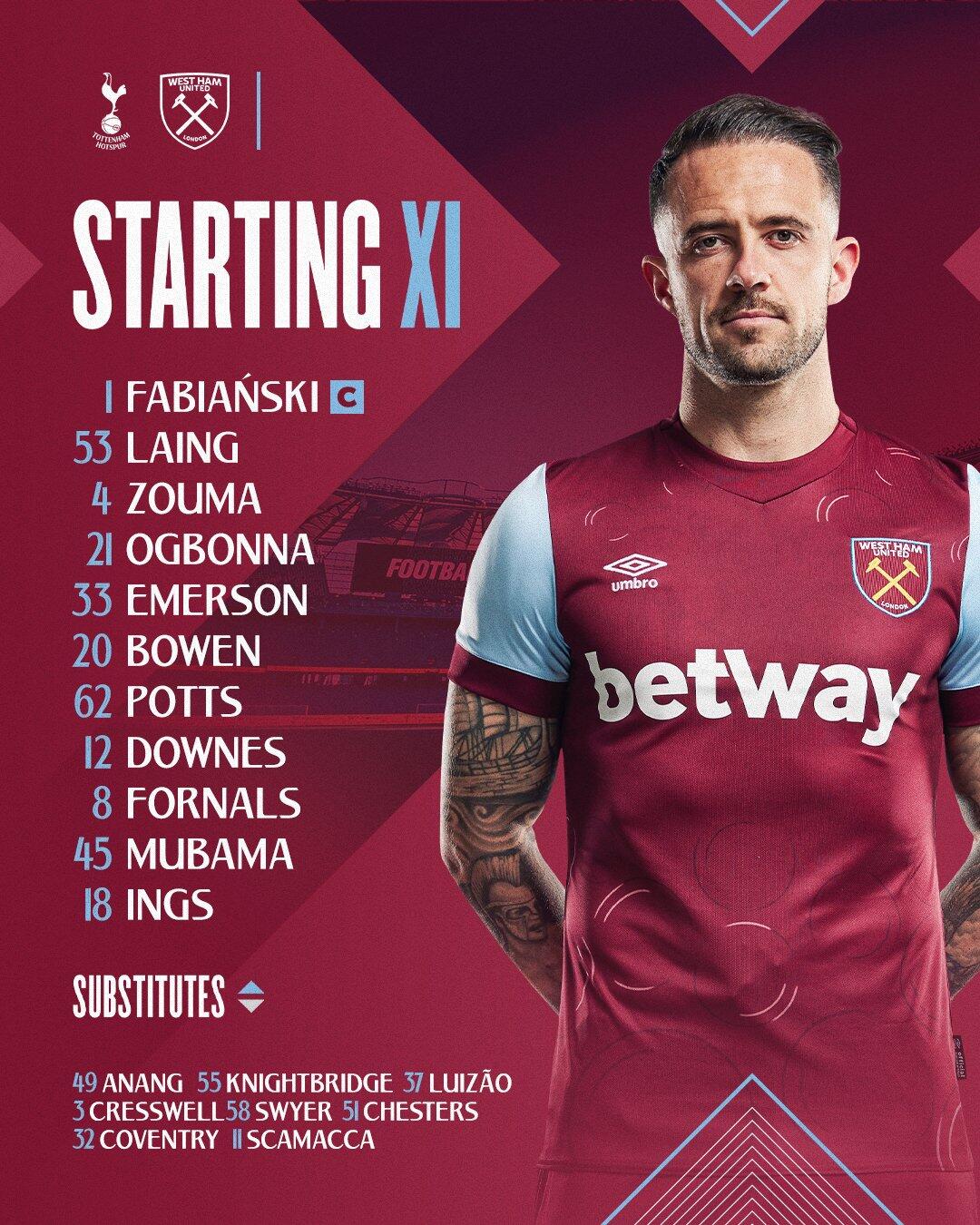 西汉姆首发:法比安斯基、莱恩、祖马、奥邦纳、埃默森、鲍文、波茨、唐斯、弗纳尔斯、穆巴马、英斯