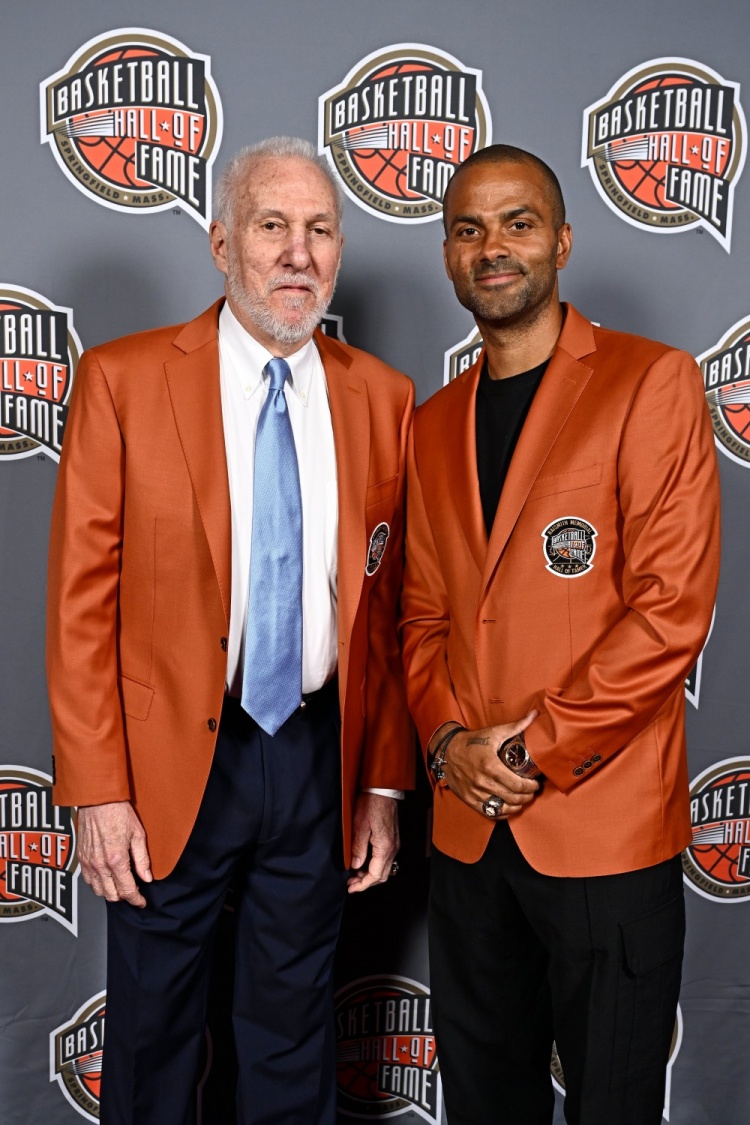 8月12日讯 马刺官推晒出了波波维奇和托尼-帕克身穿名人堂夹克的合影。