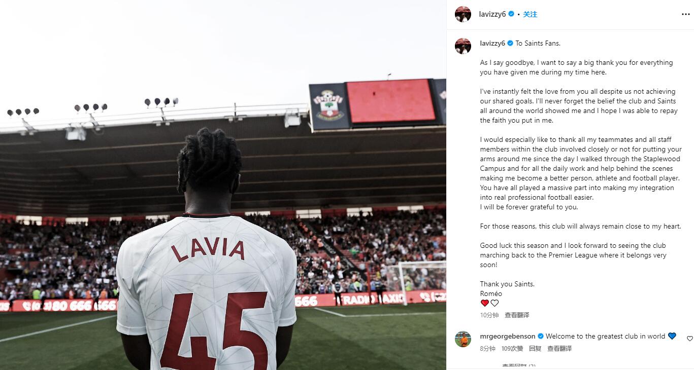 8月18日讯 即将转会切尔西的拉维亚在社交媒体上发文,向南安普顿俱乐部和球迷告别。