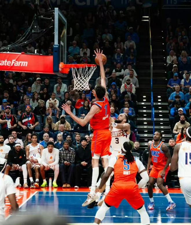 果不其然,实力占优又是主场作战的雷霆队,上来就没有客气!亚历山大状态火热,连投带突不断取分,霍姆格伦在篮下也是不可阻挡,频繁取分,多特、杰伦威同样火力全开,雷霆队进攻一波接着一波,单节轰下38分!反观太阳队,球队本来就少了2个进攻箭头,此前表现出色的吉莱斯皮本场又进攻哑火,球队单节只拿到23分,落后了15分!而雷霆的凶猛进攻还没有结束,替补席上同样火力强大,雷霆队在次节依旧是全方位吊打太阳队,本场打完,2队分差来到了26分,比赛已经被打花了!