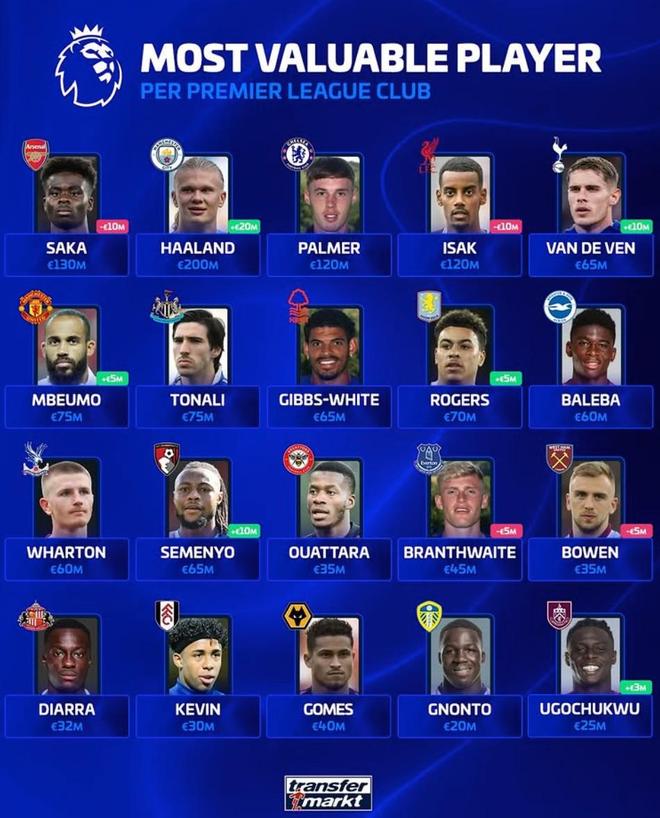 北京时间12月14日,在更新了英超球员的身价之后,德转还统计出了英超20家俱乐部各自身价最高的球员,曼城的哈兰德以2亿欧元的身价领衔,利兹联的尼奥托2000万欧元最低。德转列英超20家俱乐部最高身价球员:阿森纳 萨卡 1.3亿欧元(-1000万欧元)曼城 哈兰德 2亿欧元(+2000万欧元)切尔西 帕尔默 1.2亿欧元伊萨克 利物浦 1.2亿欧元(-1000万欧元)托特纳姆热刺 范德芬 6500万欧元(+1000万欧元)曼联 姆伯莫 7500万欧元(+500万欧元)纽卡斯尔联 托纳利 7500万欧元诺丁汉森林 吉布斯-怀特 6500万欧元阿斯顿维拉 摩根-罗杰斯 7000万欧元(+500万欧元)布莱顿 巴莱巴 6000万欧元水晶宫 亚当-沃顿 6000万欧元伯恩茅斯 塞门约 6500万欧元(+1000万欧元)布伦特福德 丹戈-瓦塔拉 3500万欧元埃弗顿 布兰斯韦特 4500万欧元(-500万欧元)西汉姆联 鲍恩 3500万欧元(-500万欧元)桑德兰 哈比卜-迪亚拉 3200万欧元富勒姆 凯文 3000万欧元狼队 若昂-戈麦斯 4000万欧元利兹联 尼奥托 2000万欧元伯恩利 乌戈舒库 2500万欧元(+300万欧元)【上咪咕独家看英超】