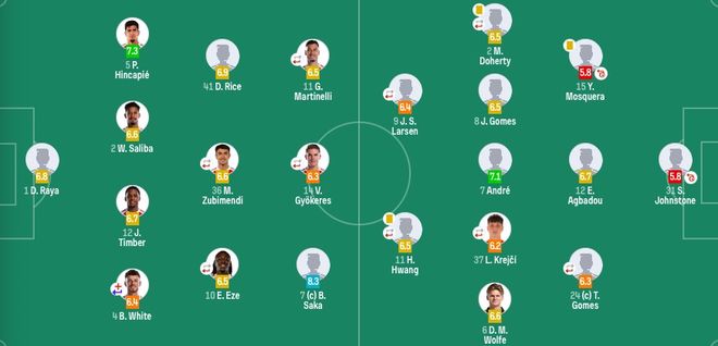 在北京时间12月14日结束的英超第16轮一场焦点战中,领头羊阿森纳在主场2-1险胜“副班长”狼队。上半场,本怀特伤退,黄喜灿失单刀,阿森纳0射正。下半场,萨卡主罚角球制造约翰斯通乌龙球,阿洛科达尔补时扳平,莫斯克拉乌龙球助阿森纳绝杀。阿森纳各项赛事2连胜,16轮后积36分,暂时领先本轮未赛的曼城5分。而此役狼队输球后,已经遭遇英超10连败,16轮2平14负仅积2分,继续排名积分榜垫底位置。【关键焦点】第70分钟,萨卡角球击中远门柱后,弹在狼队门将约翰斯通后脑勺造成乌龙,阿森纳1-0领先狼队。第90分钟,替补登场的阿洛科达尔头槌为狼队扳平,狼队1-1阿森纳。第94分钟,萨卡传中,莫斯克拉乌龙球为阿森纳绝杀,阿森纳2-1狼队。【精彩回放】第27分钟,黄喜灿获得单刀机会,禁区推射被拉亚没收。第31分钟,本怀特回追疑似拉伤,斯凯利替补登场。第33分钟,赖斯角球开出,马丁内利头球攻门偏出。第57分钟,马丁内利突入禁区,小角度兜射打偏。第67分钟,赖斯任意球直接射门,约翰斯通将球托出底线。第68分钟,赖斯弧顶高质量兜射,约翰斯通神勇扑出。第76分钟,哲凯赖什背身拿球,低射远角稍稍打偏。第83分钟,特罗萨德禁区低射,皮球稍稍偏出立柱。【球员评分】【数据统计】【出场阵容】阿森纳首发:1-拉亚、4-本怀特(31'49-斯凯利)、2-萨利巴、5-因卡皮耶、12-廷贝尔、41-赖斯、36-苏比门迪(57'23-梅里诺)、10-埃泽(57'8-厄德高)、7-萨卡、11-马丁内利(57'19-特罗萨德)、14-哲凯赖什(81'9-热苏斯)替补未出场:13-凯帕、20-马杜埃凯、22-恩瓦内里、16-诺尔高狼队首发:31-约翰斯通、2-多赫蒂(69'38-查丘瓦)、15-耶森-莫斯克拉、12-阿格巴杜、24-托迪、6-沃尔费、37-克雷伊奇(80'10-阿里亚斯)、7-特林达德、8-若昂-戈麦斯(86'36-马特乌斯-马内)、11-黄喜灿(80'28-费尔-洛佩斯)、9-拉尔森(69'14-阿洛科达尔)替补未出场:1-若泽-萨、3-乌戈-布埃诺、23-奇雷瓦、26-霍福尔