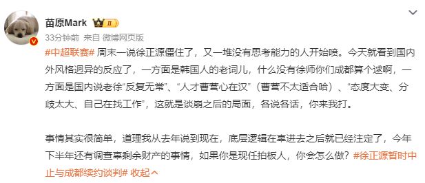 周一,《体坛周报》透露,徐正源无意与成都蓉城续约。连续两个赛季率队拿到中超季军之后,徐正源为何没有与成都蓉城续约,媒体人苗原透露,“底层逻辑在辜(建明)进去之后就已经注定了”。在2024赛季率队拿到中超季军并且拿到亚冠门票之后,徐正源按照与俱乐部签订合同中的续约条款,可以自动续约3年。然而,因为种种原因,成都蓉城始终没有履行这一条款,这导致徐正源迟迟没有与俱乐部续约,2025赛季结束之后,双方还在谈判。在《体坛周报》透露徐正源暂停续约谈判之后,媒体人苗原分析,“ 熟悉蓉城俱乐部打法的其实早就有预判,谈判每一次不顺利,锅必须要扣韩国人的头上,韩国那边也有预判,今天几个媒体已经独家在聊徐正源续约有麻烦,并再次细数他对中国足球的贡献,以及成都球迷如何殷切地希望他能够留下来。”“这么友好互动下去,肯定是裂痕越拉越大,徐正源依然有不少筹码,蓉城俱乐部要思考的是如果未来有纠纷、如果未来自己建队和引援出了问题,领导层能不能避开责任,想明白这些就可以继续往前走了。”“事情其实很简单,道理我从去年说到现在,底层逻辑在辜(建明)进去之后就已经注定了,今年下半年还有调查辜剩余财产的事情,如果你是现任拍板人,你会怎么做?”早在7月份,苗原就曾分析,“西南王时期,老徐和几个外援都是一个公司的,后来公司和西南王涉案了,经纪人进不来,一直在国内和韩国催债,包括不限于经纪费、冬训费、传说的B份费用。但俱乐部早改朝换代了,新的领导换来换去,都不可能认以前的包袱的,何况还涉案,别说给钱了,晚一点切割都怕连累到自己。”值得一提的是,从2024年6月至今,成都蓉城俱乐部已经换了三任董事长,分别是朱澜波、俞杨、王磊。不过,这一说法受到过质疑。记者肖良志表示,“从中甲一路走来,我想任何一个执教成都蓉城的主教练,获得与成绩和地位相称的年薪都不为过。至于有人说是辜建明签的,试问,一个在俱乐部没有任何具体职务、只是顾问的人,有权签订合同吗?你们找出一个例子来,我服。”