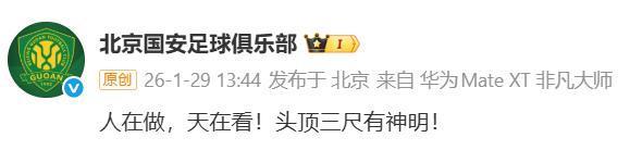 29日,在遭中国足协处罚后,北京国安足球俱乐部在官方微博发文:人在做,天在看!头顶三尺有神明!