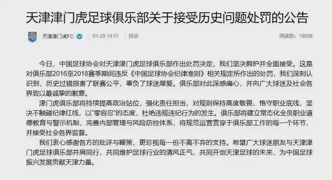 29日,天津津门虎足球俱乐部发布公告回应处罚:坚决拥护并全面接受,向球迷及各界致以最诚挚的歉意。