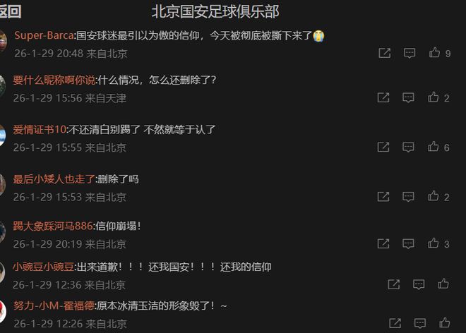 结果出来后,原先北京国安也象征性硬刚一下,不久又删文。此举引起北京国安球迷的不满,大家又在最近的动态下留言(下图)。有球迷非常失望地写道:“国安球迷最引以为傲的信仰,今天被彻底被撕下来了[泪]”,还有球迷感叹原本冰清玉洁的形象毁了。更有球迷要求“出来道歉!还我国安,还我信仰”。