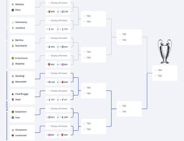 在联赛阶段结束后,1/8决赛的四组分区也已经确定。不过今晚不会确定1/8决赛的具体对阵情况,1/8决赛抽签将在附加赛结束后,于北京时间2月27日晚间进行。但直通1/8决赛的球队已经得知了自己的4个潜在对手。