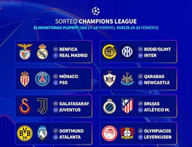 注:根据欧足联规则,联赛阶段排名靠前的球队(第9–16名)将在次回合主场作战。因此上述对阵中,皇马、国米、巴黎、纽卡、尤文、马竞、亚特兰大、勒沃库森均将在第二回合坐镇主场。