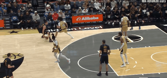 图1,萨尔夹击卢卡,卢卡起跳,还扫了一眼三分线,这才天马行空划给顺下艾顿,艾顿内切。