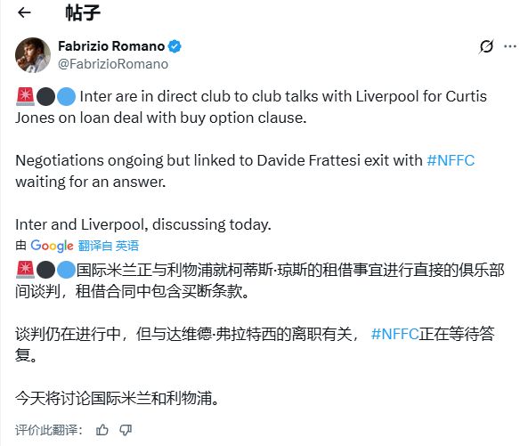 罗马诺在X(推特)上表示:“国际米兰正与利物浦就柯蒂斯·琼斯的租借交易进行了俱乐部层面谈判,该交易包含购买选择权条款。谈判正在进行中,但与弗拉泰西的离队相关,诺丁汉森林正在等待答复。”