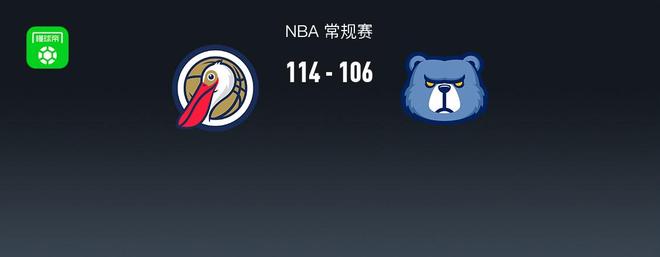第四节鹈鹕德里克-奎因拿下8分,灰熊凯姆-斯宾塞拿下6分,最终鹈鹕114-106战胜灰熊