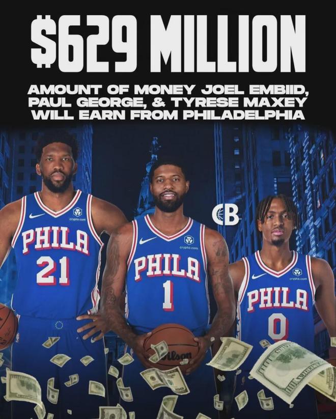 恩比德合同还剩4年2.48亿美元,2029年夏天到期,平均年薪超过6000万美元。马克西合同5年2.04亿美元,也是2029年夏天到期,还剩4年1.69亿美元。乔治合同4年2.12亿美元,2028年夏天到期,还剩3年1.63亿美元。