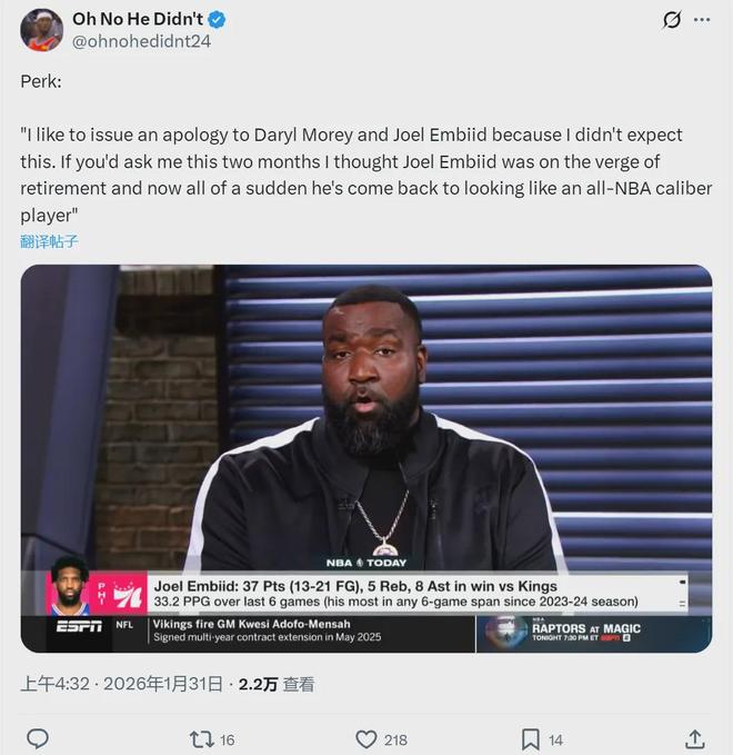 北京时间1月31日,NBA评论员帕金斯公开道歉:“我要向乔尔-恩比德道歉,因为我完全没料到会这样。如果你在两个月前问我,我会说恩比德快要退役了!可是恩比德现在突然找回状态,还打出了全明星和最佳阵容级别的表现。”