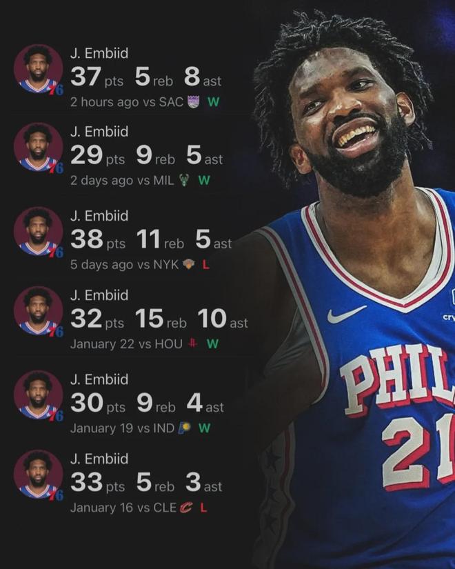 整个1月份,恩比德已经6次单场砍下30+!他上一次做到这一点,还是两年前的2024年1月份。恩比德状态回暖,他也开始给球队施压:“过去我们总在想方设法避税,希望这次球队能提升阵容,在保留核心的前提下,完成实力升级。”