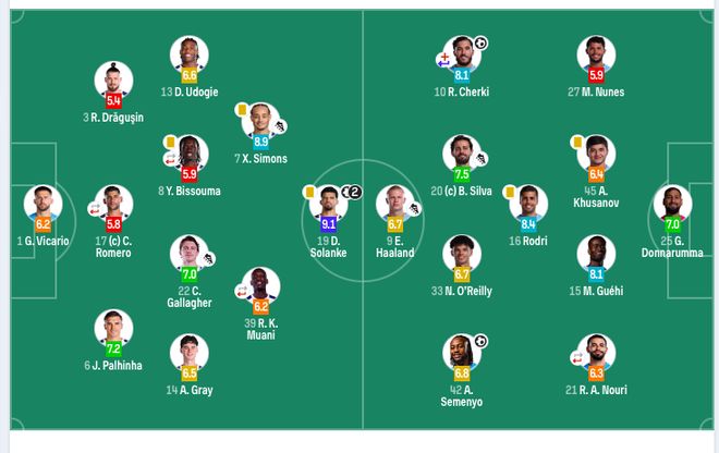 曼城首发:25-多纳鲁马、27-努内斯、45-胡桑诺夫、15-格伊、21-艾特-努里(68’14-尼科·冈萨雷斯)、16-罗德里、20-B席(88’47-福登)、33-奥赖利、42-塞梅尼奥、10-谢尔基(68’4-赖因德斯)、9-哈兰德。