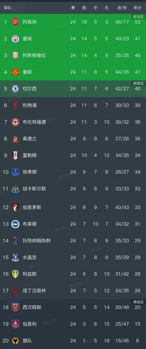 英超最新积分榜