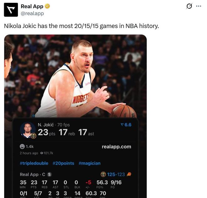 同时本场比赛是约基奇生涯第17次单场轰下至少20+15+15大号三双,再度创造NBA历史第一纪录。